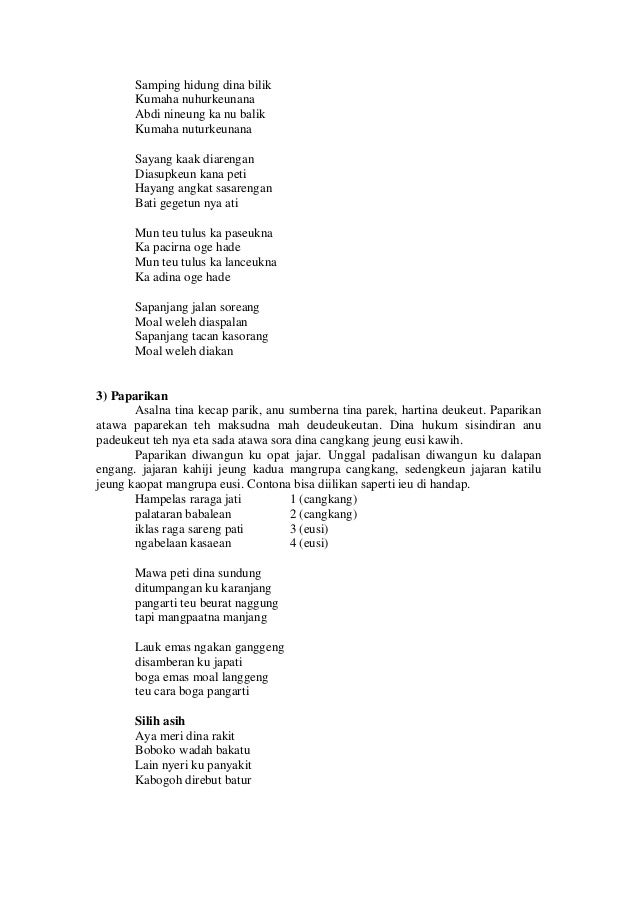 Dibawah ini sudah disediakan beberapa contoh rarakitan silih asih tersebut. 35 Contoh Paparikan Sisindiran Silih Asih Piwuruk Sesebred. Pantun ialah sebuah cerita tutur dalam bentuk karya sastra Sunda lama yang disajikan secara paparan prolog dialog dan seringkali dinyanyikan.