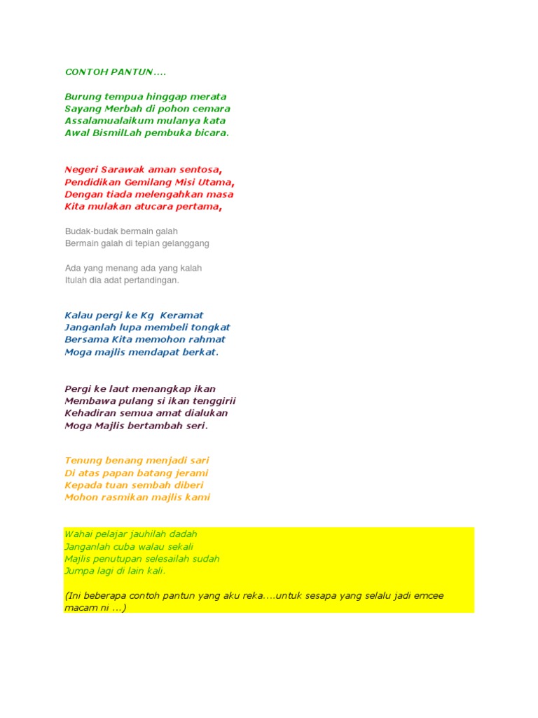 Pantun Penutup Pidato Salah satu syair dalam karya seni yang ditampilkan dalam puisi kuno dengan ciri khas memiliki 4 baris sajak a-b-a-b yang terdiri dari sampiran. Bagi Anda yang mencari Pantun Melayu Sebagai Pantun Penutup Pidato atau Pantu Pembuka Pidato kami rasa anda berkunjung ke website yang tepat. Dan diwariskan dari satu generasi ke generasi berikutnya.